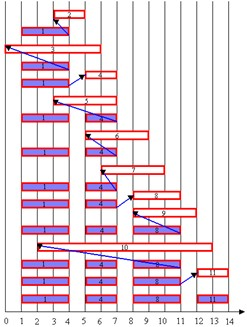 算法greedySelector 的计算过程如下图所示。图中每行相应于算法的一次迭代。阴影长条表示的活动是已选入集合A的活动,而空白长条表示的活动是当前正在检查相容性的活动。