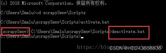 先要进入cd到虚拟环境的位置(目录)的Scripts中,然后在激活(activate.bat)虚拟环境,则进入新建的虚拟环境中了。