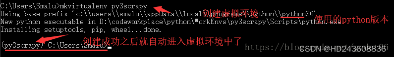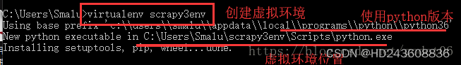 这个命令创建虚拟环境,会在当前所在目录进行创建,如C:\Users\Smalu(电脑管理者路径)