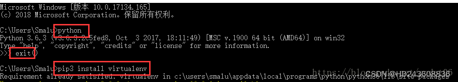 打开windows命令终端(cmd)安装虚拟环境 virtualenv(如果你执行了上面查看python版本的语句,那么要先使用exit()方法先退出)
