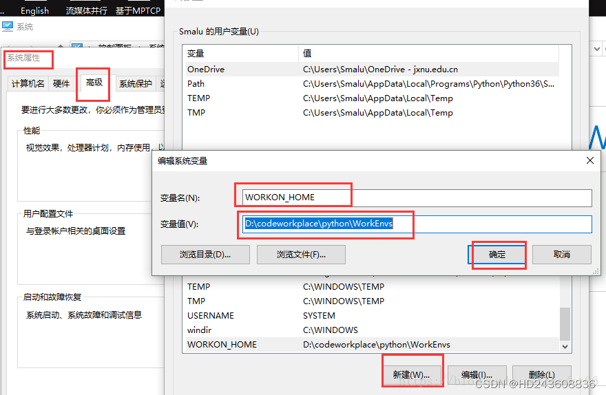 4.2 配置电脑系统环境变量,->新建系统变量 -> 变量名:WORKON_HOME ->指定路径:D:\codeworkpace\python\envs