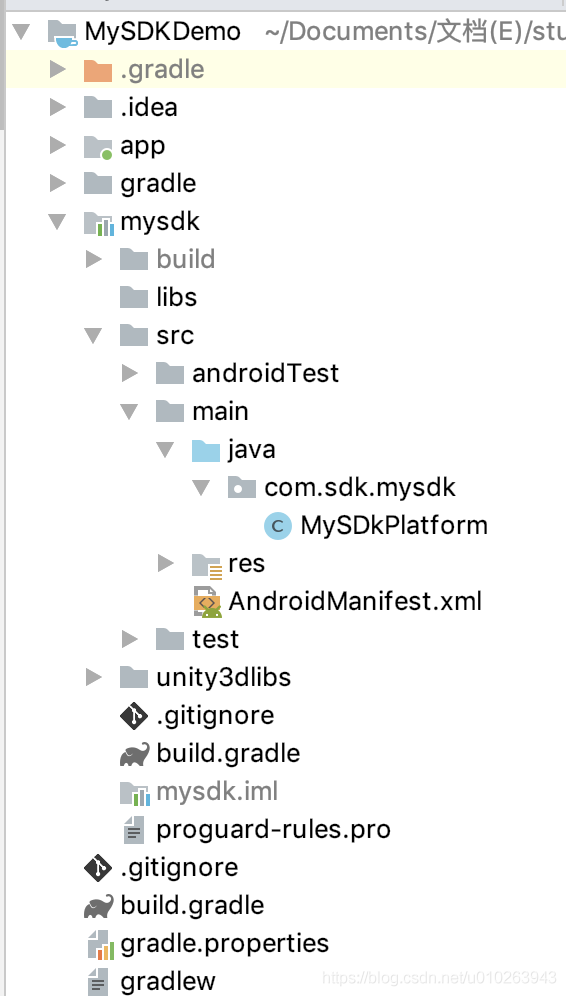 先看SDK库工程目录,mysdk是SDK库工程,app是一个依赖于SDK库工程的demo,其中只有一个MainActivity类,便于开发时进行测试,mysdk中只有一个MySDkPlatform类,这个类就是unity接入需要调用的接口类;