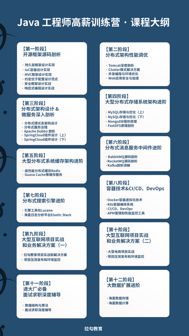 以上所有资料内容均来自拉勾教育《Java工程师高薪训练营》,课程对标阿里 P7 ,还与你签订内推/就业协议,学完就内推,简历直达技术 leader ,不怕找不到好工作!