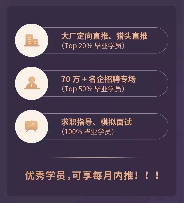 学员报名的时候就可以签订内推协议,学完直接跳过简历筛选(拉勾数据显示:仅有8%的简历能顺利通过筛选),内推至技术面试环节,提高面试通过率!(拉勾的内推大厂流程,先是送到技术部门,大致是2-3轮技术面,然后是1轮hr面。)