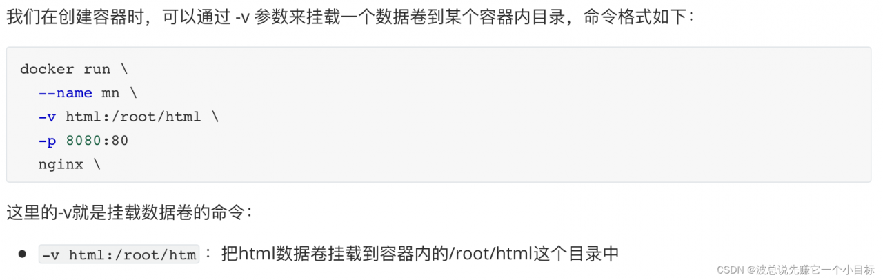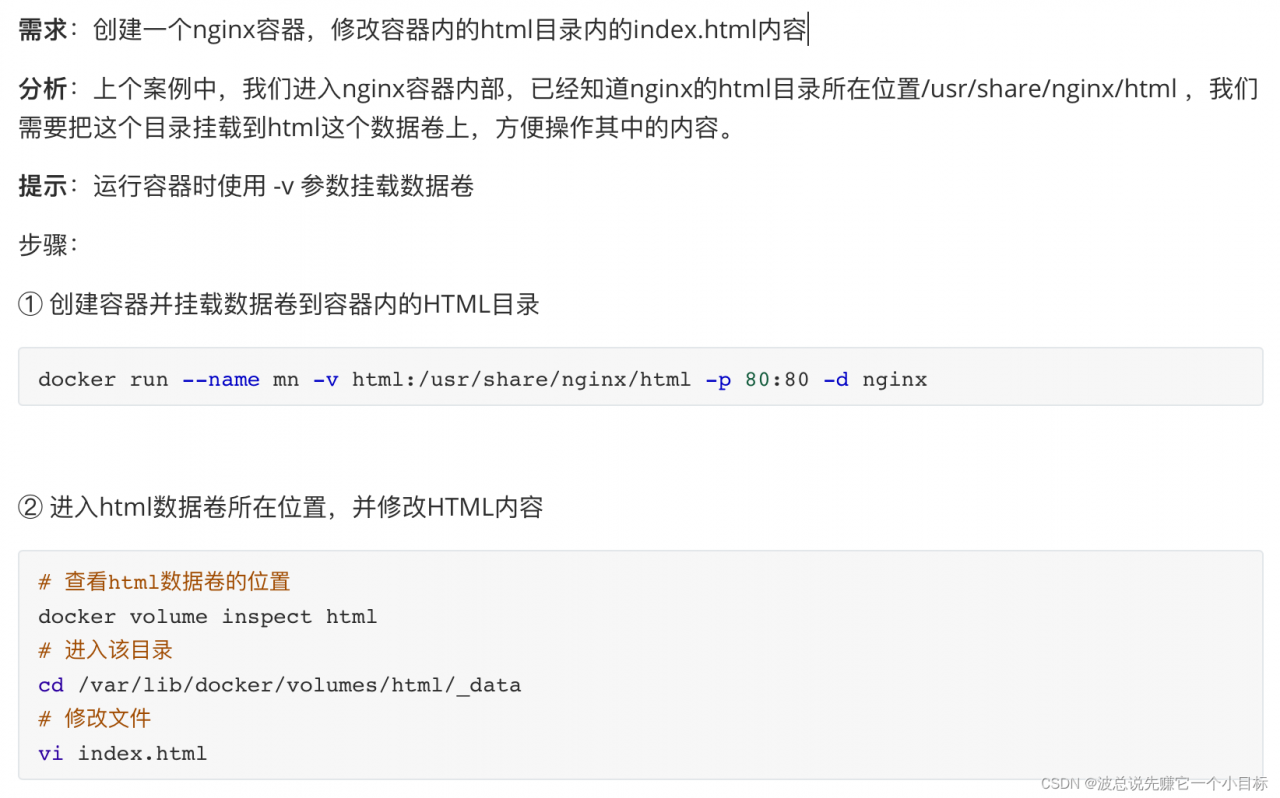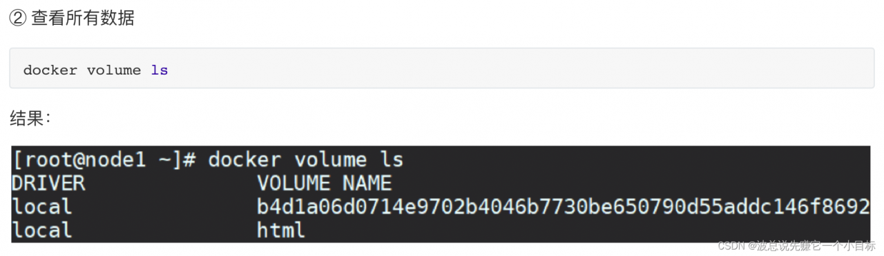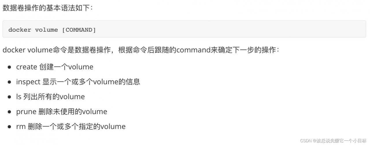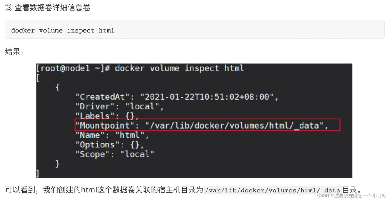 docker volume inspect:查看数据卷详细信息,包括关联的宿主机目录位置