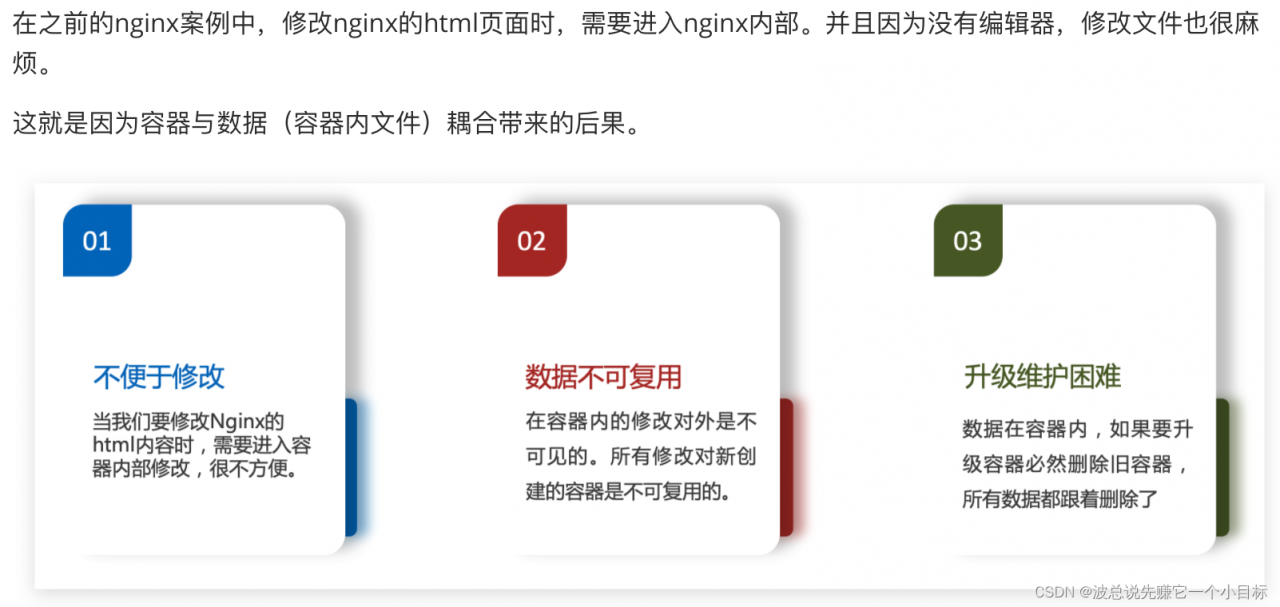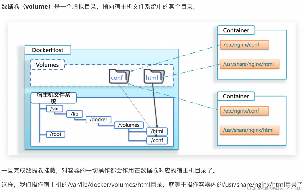 要解决这个问题,必须将数据与容器解耦,这就要用到数据卷了。