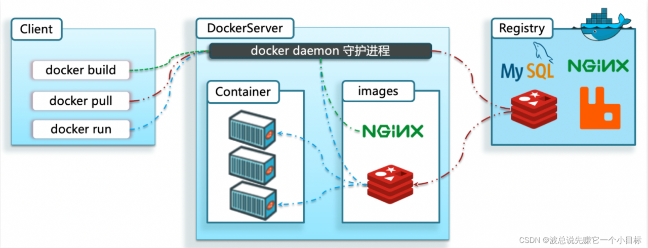 服务端(server):Docker守护进程,负责处理Docker指令,管理镜像、容器等