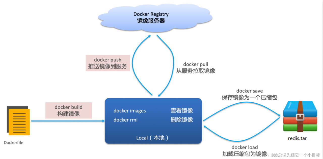 镜像(Image):Docker将应用程序及其所需的依赖、函数库、环境、配置等文件打包在一起,称为镜像。