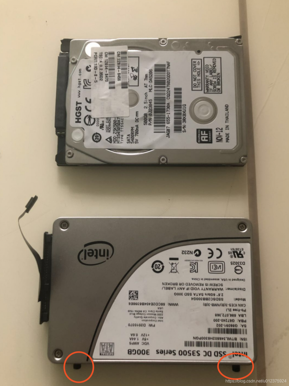 接头背面黏在硬盘的塑料纸上了,需将它撕开。原硬盘的旁边有两个螺丝,将它们取下,对应的接到固态硬盘上。