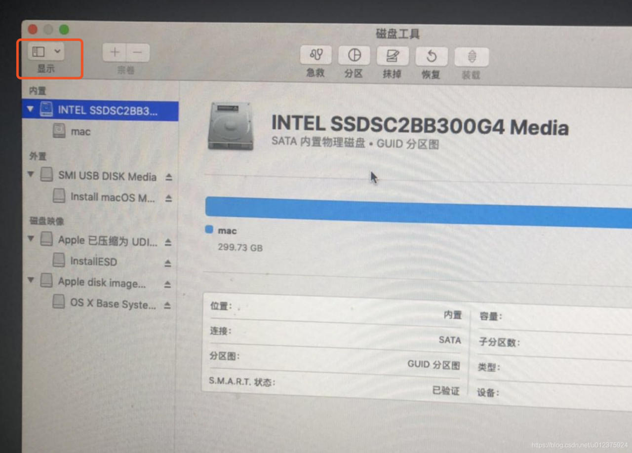先选择磁盘工具,将之前添加的固态硬盘抹掉,「Mac OS X 扩展(日志式)」格式。这里注意下,在重新分区时,看下左上角边栏的显示选项,选择显示所有设备,在内置里可以看到INTEL开头的字样,选择它,再选择抹掉,即可添加GUID分区。