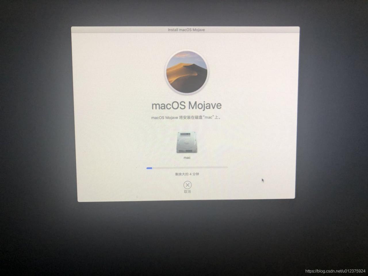 如无意外的话,会看到一个安装图标,选择install, 会出现个苹果的标志和进度条,完成后,进入安装界面。