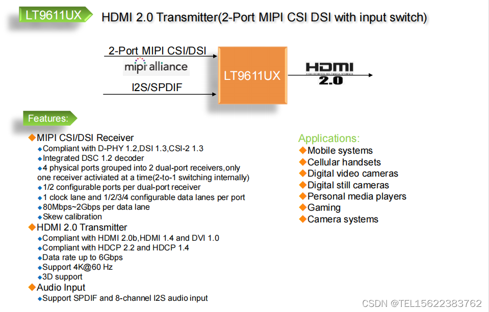 描述 | 2 port MIPI DSI/CSI with DSC to HDMI 2.0, TX, QFN64 7.5x7.5 |
