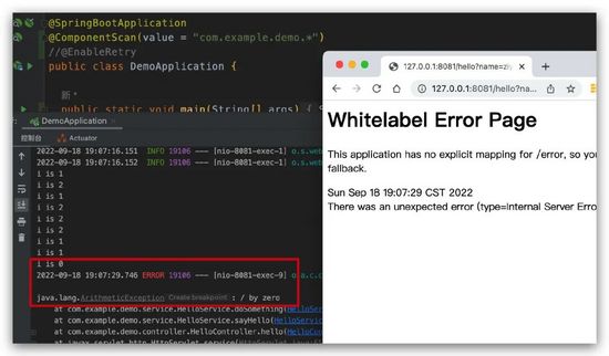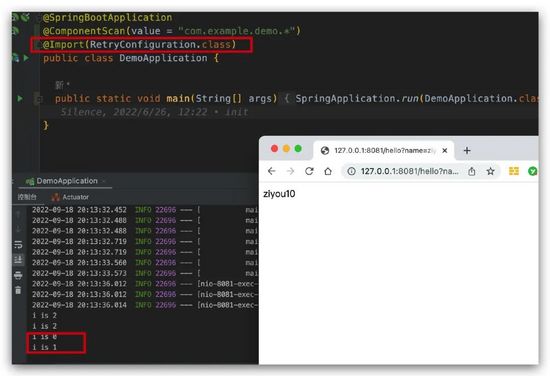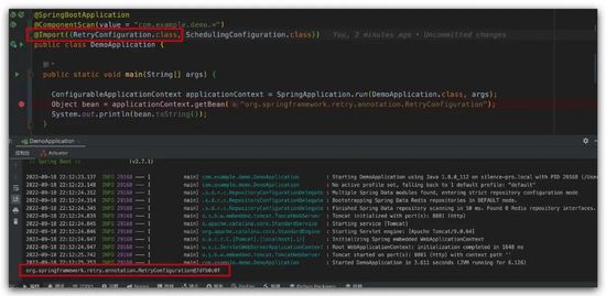 可以看到源码很简单,其中最有用的就一行 @Import(RetryConfiguration.class) ,我们可以尝试把这一行代码放到启动类上面看看效果,如下所示,可以看到项目可以正常启动,并且也还是有效果的,说明跟我们的 @EnableRetry 注解是一样的。