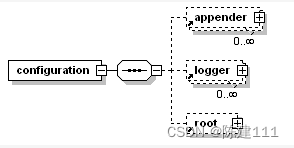 logback.xml配置文件的基本结构可以描述为<configuration>元素,包含零个或多个<appender>元素,后跟零个或多个<logger>元素,后跟最多一个<root>元素(也可以没有)。