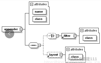 appender使用<appender>元素配置,该元素采用两个必需属性name和class。name属性指定appender的名称,而class属性指定要实例化的appender类的完全限定名称。<appender>元素可以包含零个或一个<layout>元素,零个或多个<encoder>元素以及零个或多个<filter>元素,下图说明了常见的结构: