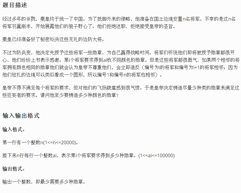 #include <cstdio> #include <cstring> #include <iostream> #include <algorithm> #define N 20007 using namespace std; int n, a[N], maxn[N], minn[N], l, r, ans; bool check(int x) { maxn[1] = minn[1] = a[1]; for(int i = 2; i <= n; i++) maxn[i] = min(a[i], a[1] - minn[i - 1]), minn[i] = max(0, a[i] - (x - a[i - 1] - a[1] + maxn[i - 1])); return !minn[n]; } int main() { scanf("%d", &n); for(int i = 1; i <= n; i++) scanf("%d", &a[i]), l = max(l, a[i] + a[i - 1]); r = l << 1; while(l <= r) { int mid = l + r >> 1; if(check(mid)) ans = mid, r = mid - 1; else l = mid + 1; } printf("%d", ans); return 0; }