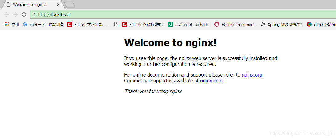 6、在浏览器中访问localhost,便可看到nginx成功安装并运行的页面。(默认监听端口80)