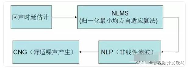 以WebRTC为例,其中的回声抑制模块建议移动设备采用运算量较小的AECM算法,该算法的处理步骤如下图所示。有兴趣的读者可以参考AECM的源代码进行研究,这里不展开介绍了。
