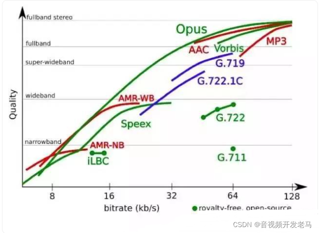 - 1)对于固定码率的编码标准:如G.711或者G.722,图中采用单点表示,说明这两个编码标准是固定码率编码标准。其他如Opus、Speex,它们的曲线是连续的,说明这类编码标准是可变码率的编码标准。