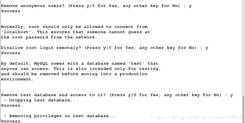 依次是移除匿名用户,不允许root用户远程登陆,移除test数据库,刷新数据库,全选yes;