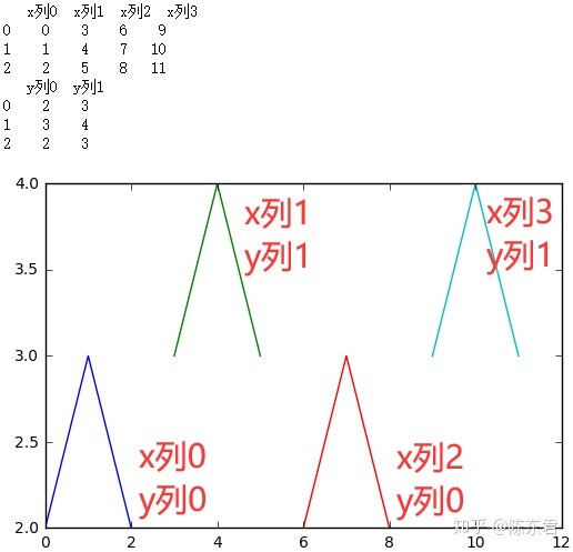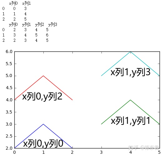 dic2={'y列0':[2,3,2],'y列1':[3,4,3],'y列2':[4,5,4],'y列3':[5,6,5]}