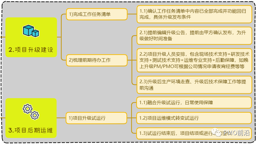 项目升级人员安排,包含现场技术支持+研发技术支持+测试技术支持+运维专业支持+后勤保障,如晚上升级PM/PMO可根据公司情况申请夜宵经费等等