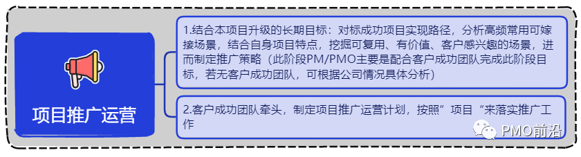 1.结合本项目升级的长期目标:对标成功项目实现路径,分析高频常用可嫁接场景,结合自身项目特点,挖掘可复用、有价值、客户感兴趣的场景,进而制定推广策略(此阶段PM/PMO主要是配合客户成功团队完成此阶段目标,若无客户成功团队,可根据公司情况具体分析)