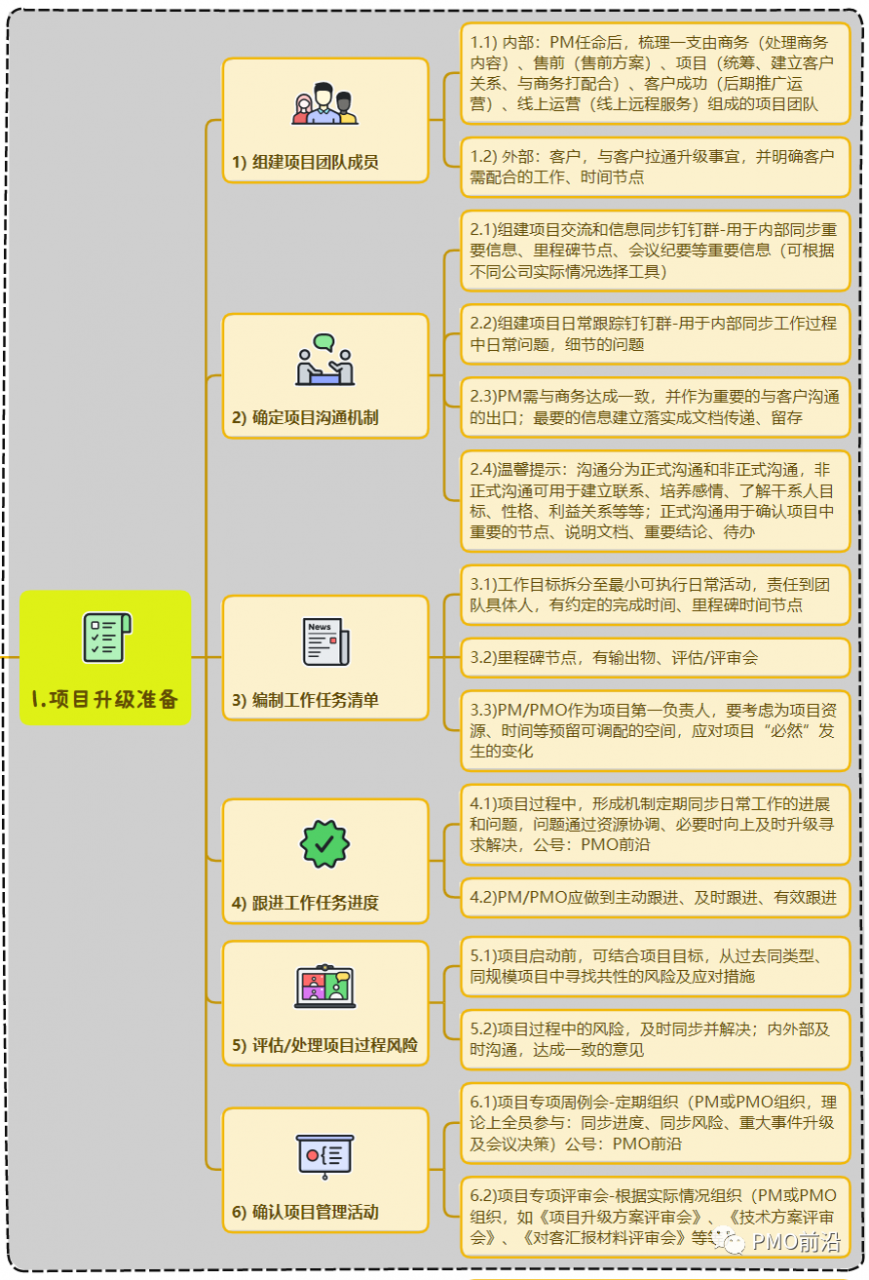 内部:PM任命后,梳理一支由商务(处理商务内容)、售前(售前方案)、项目(统筹、建立客户关系、与商务打配合)、客户成功(后期推广运营)、线上运营(线上远程服务)组成的项目团队
