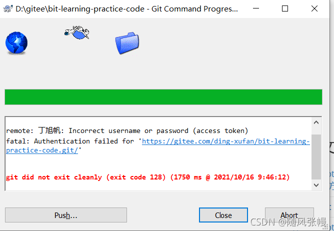 4.push最后用户名和密码不正确导致无法push,错误有界面如下图。