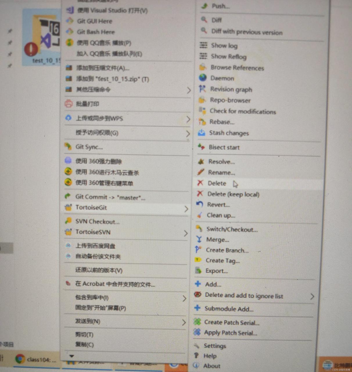 选中文件点击右键,如下图步骤进行删除,然后进行commit和push操作。
