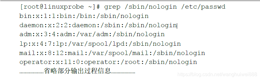 grep命令是用途最广泛的文本搜索匹配工具,虽然有很多参数,但是大多数基本上都用不到。我们在这里只讲两个最最常用的参数 :-n参数用来显示搜索到信息的行号; ;-v参数用于反选信息(即没有包含关键词的所有信息行)。这两个参数几乎能完成您日后 80%的工作需要,至于其他上百个参数,即使以后在工作期间遇到了,再使用 man grep命令查询也来得及。在Linux系统中, ,/etc/passwd文件是保存着所 有的用户信息,而一旦用户的登录终端被设置成 /sbin/nologin,则不再允许登录系统,因此可以使用 grep命令来查找出当前系统中不允许登录系统的所有用户信息: