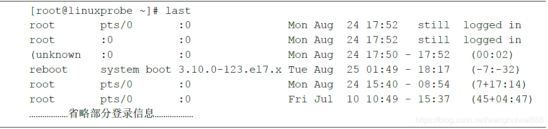 last命令用于查看所有系统的登录记录,格式为“ last [参数 ]”。