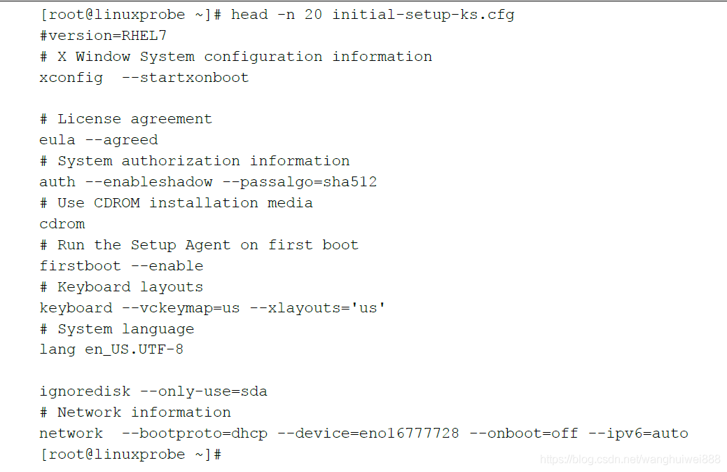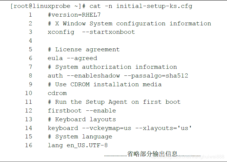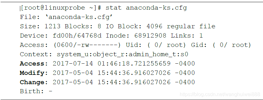stat命令可以用于查看文件的存储信息和时间等信息,命令 stat anaconda-ks.cfg会显示出