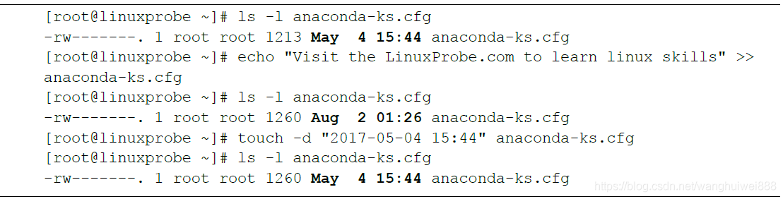 接下来,我们先使用ls命令查看一个文件的修改时间,然后修改这个文件,最后再通过 touch命令把修改后的文件时间设置成修改 之前 的时间(很多黑客就是这样做的呢):