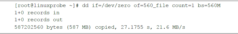 例如我们可以用dd命令从 /dev/zero设备文件中取出一个大小为 560MB的数据块,然后
