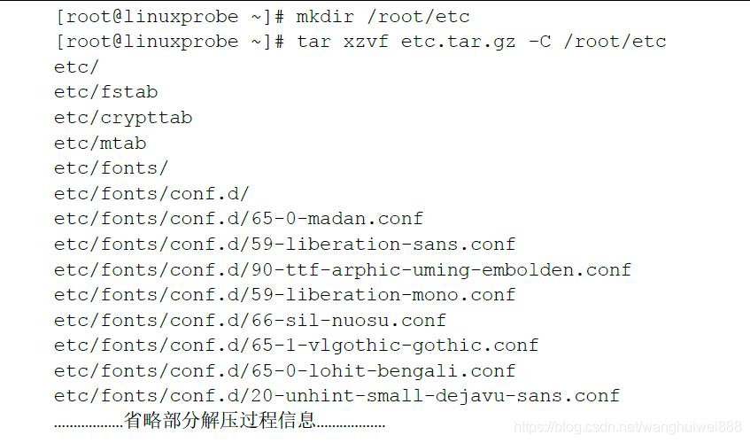 接下来将打包后的压缩包文件指定解压到/root/etc目录中(先使用 mkdir命令来创建/root/etc目录):