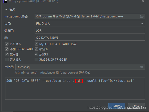 - out path:选择生成的sql文件的存放地址,有时候自动生成的路径会缺少XX.sql,需要自己补齐、为sql文件命名。