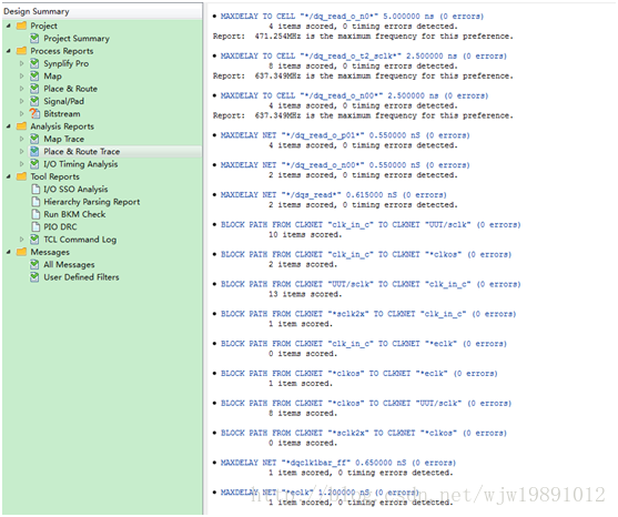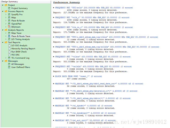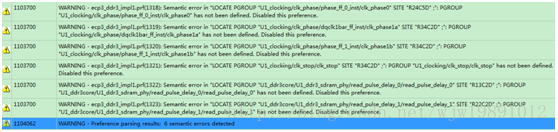 以上是修改后的时钟约束命令,FREQUENCY表示约束时钟频率;PRIMARY表示约束成走全局时钟网络,注意哦,lattice ecp3只有八个全局时钟网络,而且有器件位置限制,最后以约束成功为标志。上面vclk_c我工程中的另一个时钟和DDR3无关。注意这里的各个信号的模块路径应该以自己工程模块路径为准,以上只是本人项目中的路径,网友要修改为自己的。下面的修改方式都是以我的工程模块为准的。