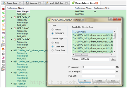 1、那么好,首先点击period/frequency按钮弹出如下界面,找到sclk,发现它是在我UUT模块里面的,不在顶层,难怪按照官方的约束好不到这个clock net,那么好,直接关掉,然后去修改ecp3_ddr3.lpf文件,上面所提示的错误挨个这样找到相应的路径,重复N次,然后写到lpf文件中。其中net名称以这里为准。
