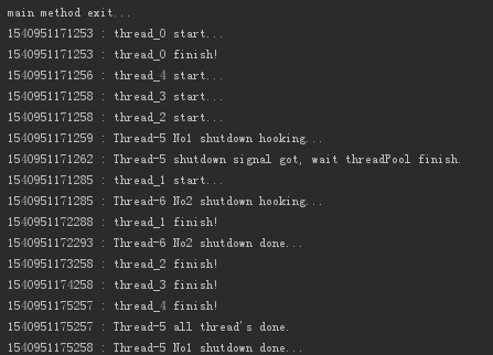 System.out.println(System.currentTimeMillis() + " : " + Thread.currentThread().getName() + " shutdown signal got, wait threadPool finish.");