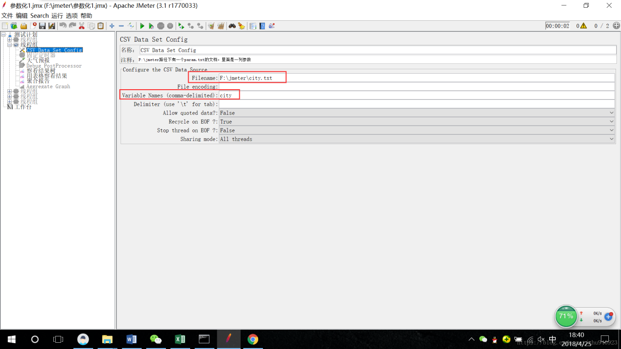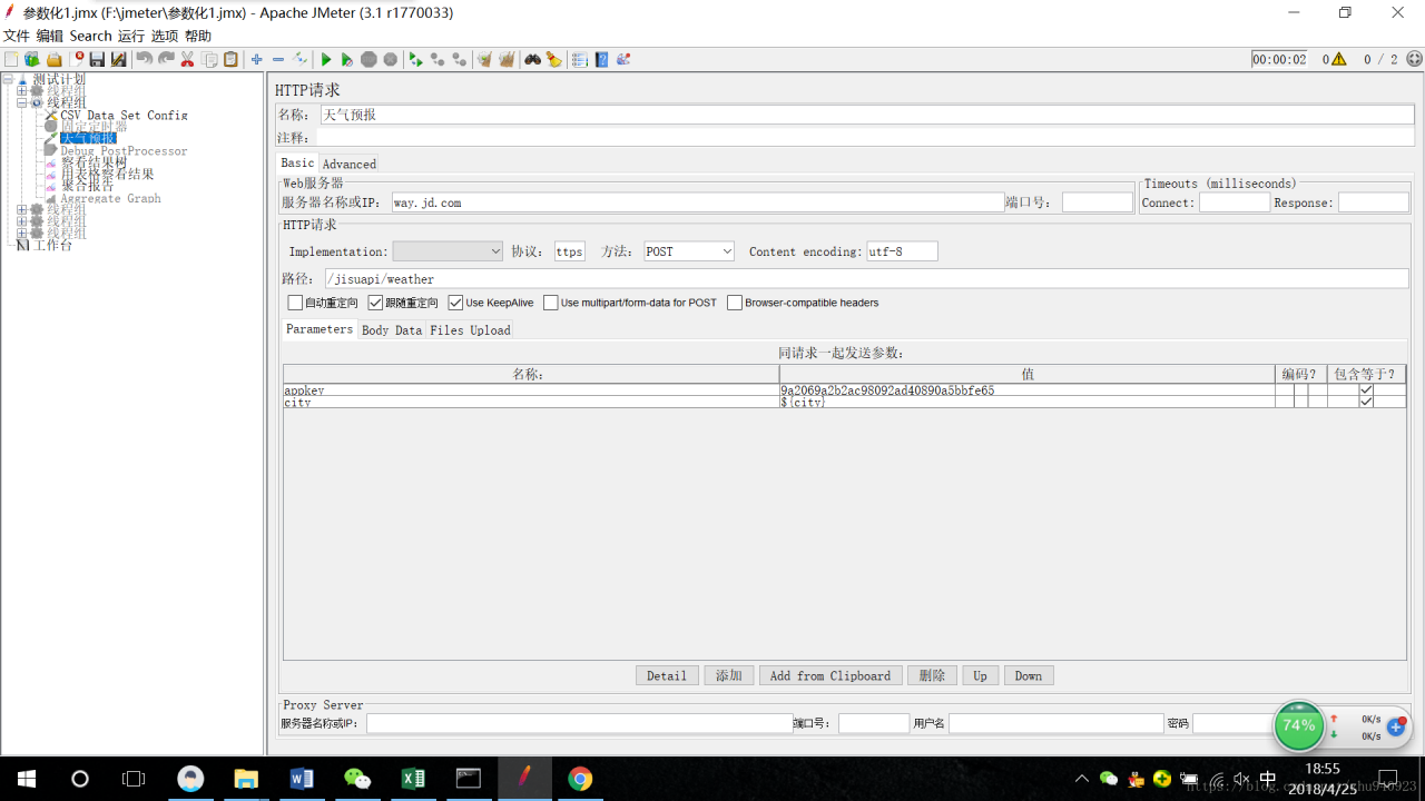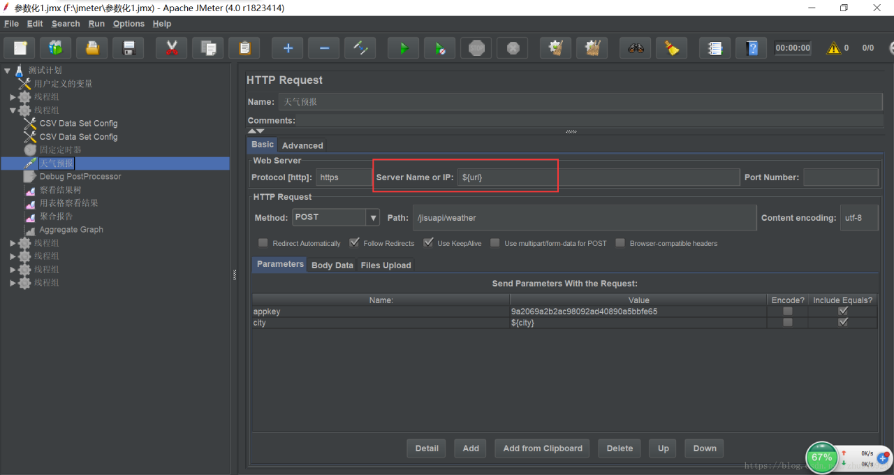 和一般的http请求差不多,只是在传参数那里,看第二个传的参数。这里我为了省事,传的city这个参数,后面的参数值,就是引用上面CSV Data Set Config的Variable Names (comma-delimited),那里我写的city,这里格式就是这样:${city}。写到这里应该比较清楚了,用CSV Data Set Config调取文件,获取参数值,放到http请求里传出去。