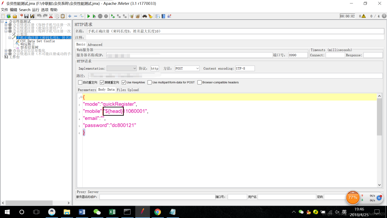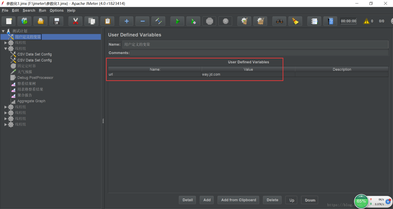 IP那里被参数化了,可以执行。这么参数化下来,以后就不怕服务器IP再变了,如果变动,直接改一下用户定义的变量里面那个url的值就可以了。这种参数化方法适用于大量的HTTP请求里有相同的信息。(jmeter4.0可以设置成中文的,截图时候没设置)