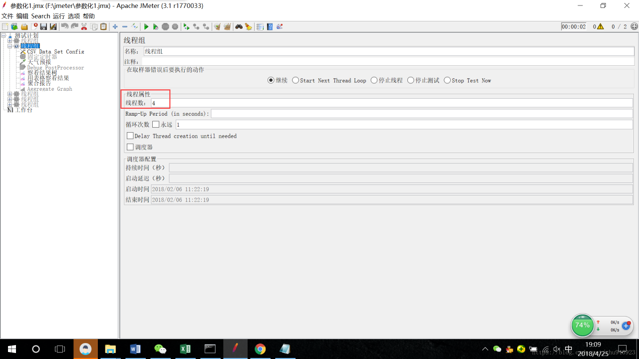 这里线程数设置为4,执行时候就自动获取参数,把文件里的4个参数都获取一遍,如果参数很多,可以使用这种参数啊化方法。就像我用过一次测试手机号段的,从100-199,一共100个号段,就是用的这种参数化。