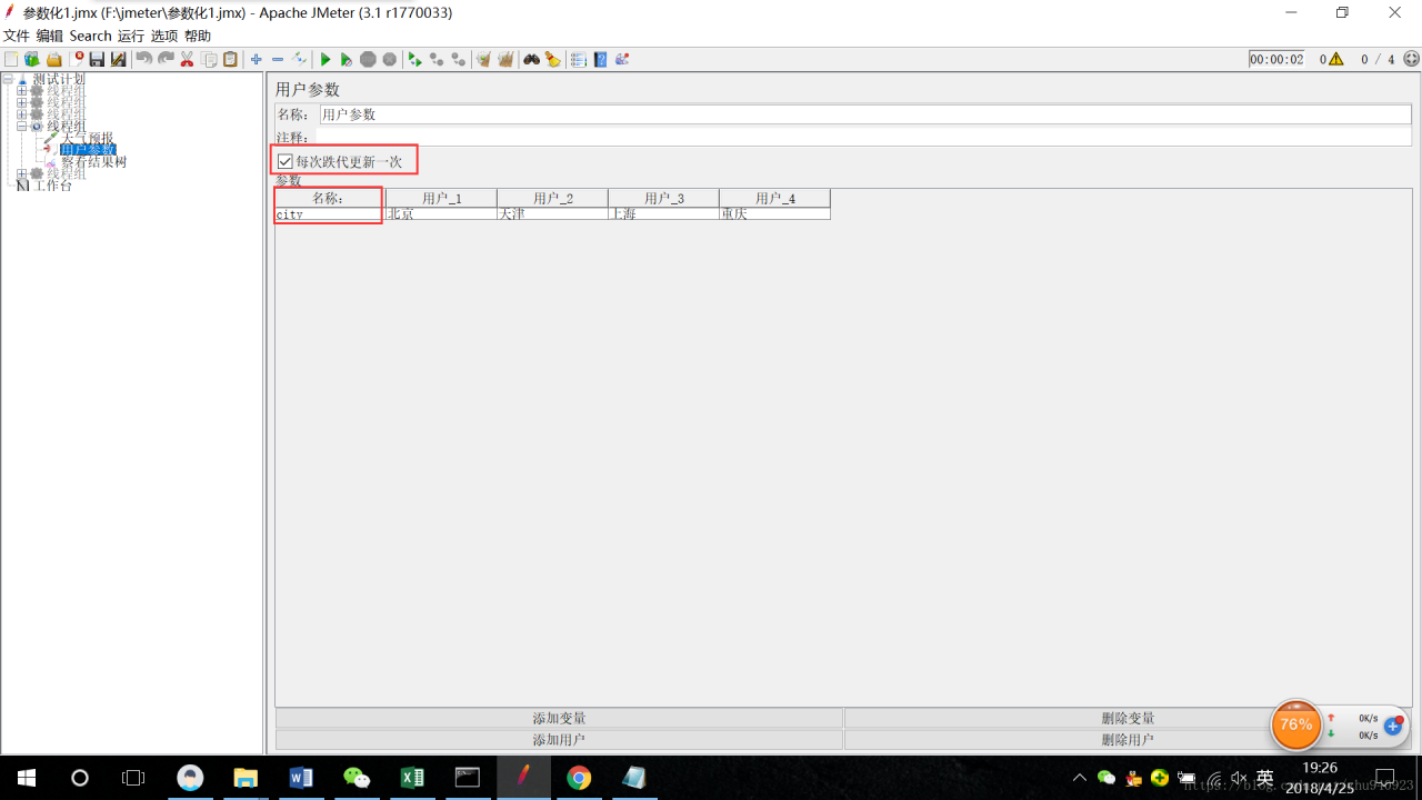 我这里名称还是用的city,后面的用户1、2、3、4,就是四个参数,一定要勾选“每次迭代更新一次”,不然执行了几次,都是取的一个城市,http请求还和第一种参数化写法一样,再附一张图。