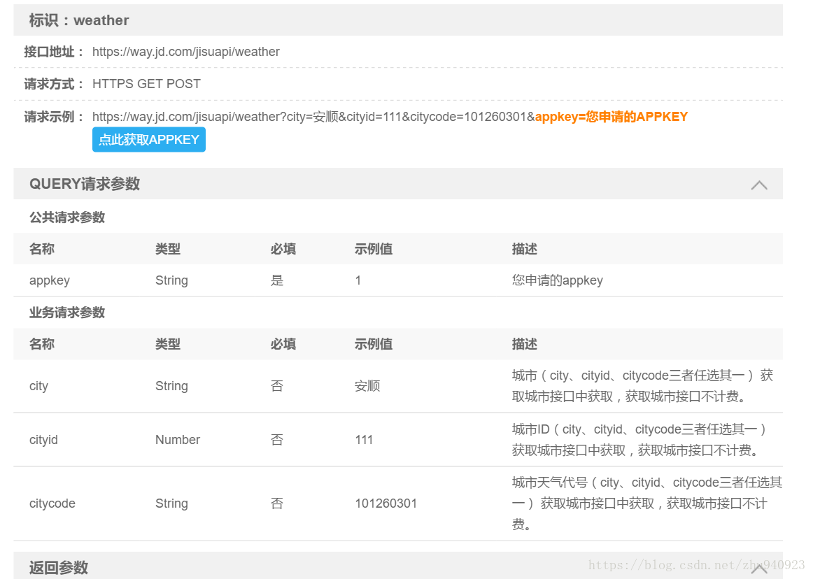 我学参数化时候用了“京东万象”的接口,那里提供很多接口可以供学习者使用,不用再因为学习接口测试而想办法抓包了。这里我主要用的是一个查询天气预报的接口,输入城市,就可以查这个城市的天气预报,下面是这个接口的信息。