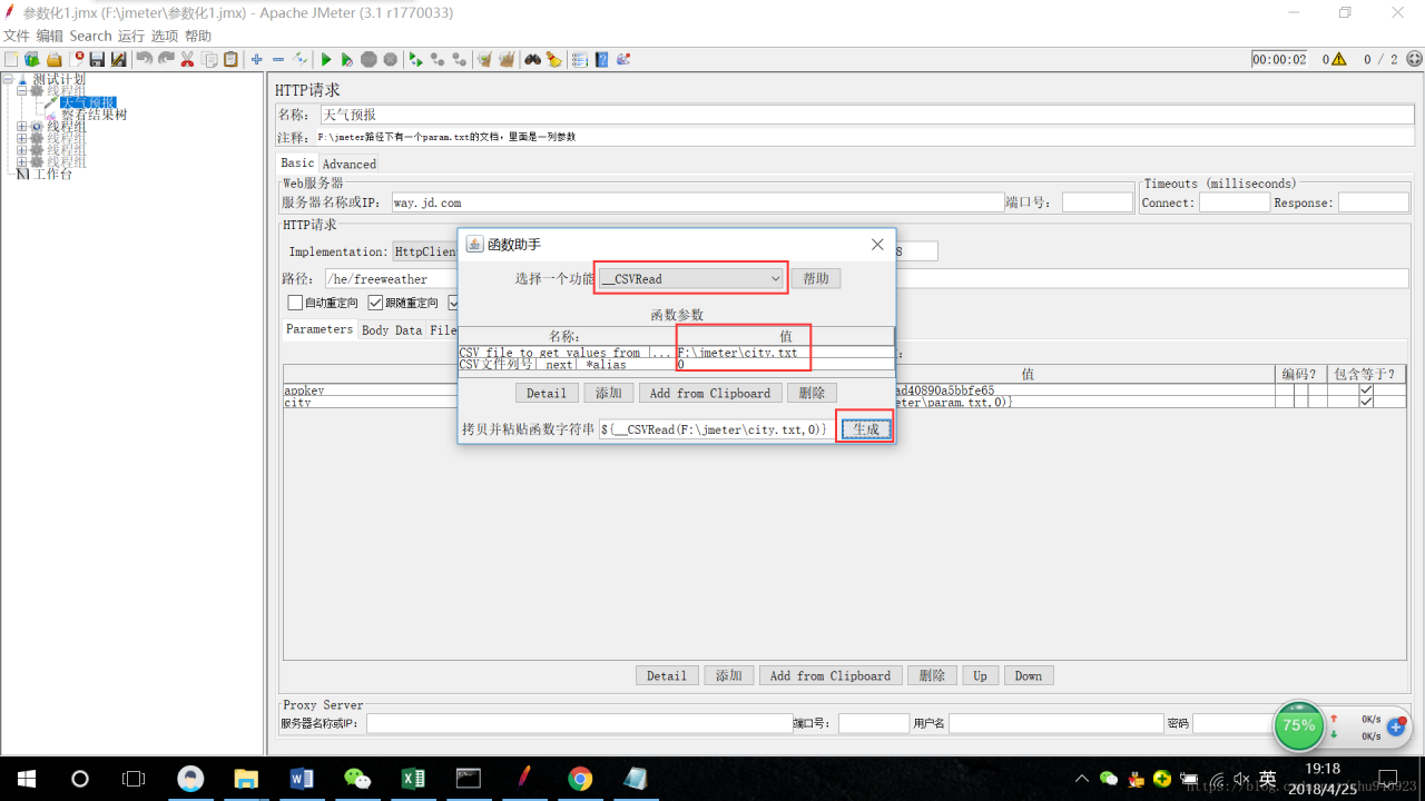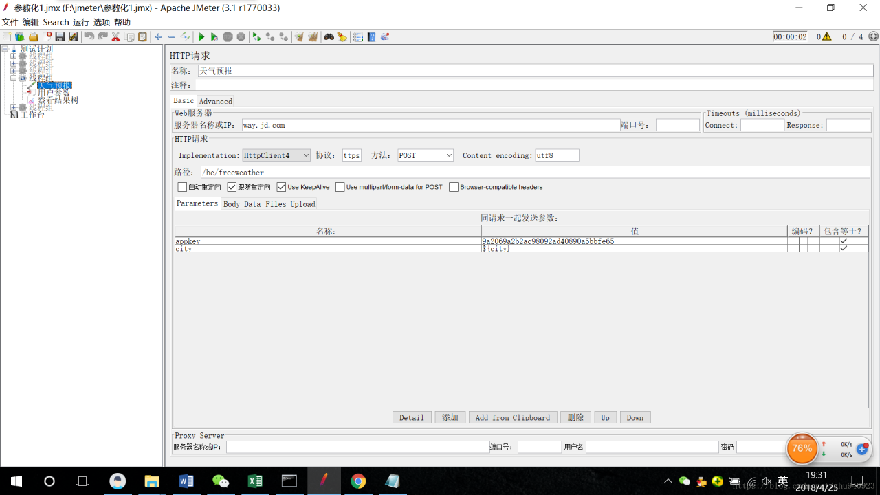 这也是一种参数化方法,之前觉得有第一种和第三种就够了,因为用户定义的变量,并不能让一个参数有多个参数值可选,不明白为什么要有这个功能,直到今天突然领悟了,还要感谢项目中实践。之前测接口,有几百种情况,写了几百个HTTP请求,那会儿也没弄参数化,今天又发布了一版,而且IP地址变了,这下就得改几百个IP了,虽然只是简单的复制粘贴。改了几个突然想到了参数化,IP这里能不能参数化呢?如果能用哪种好?很快就想到了这个之前感觉很鸡肋的方法。下面就是这种参数化的使用方法,还是用的查询天气预报接口。(这期间把jmeter升成4.0了,只能截4.0的图了)