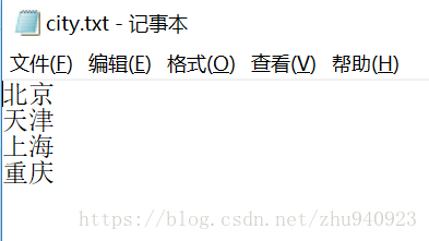 Filename:写参数文件放置的位置,应该也可以用相对路径,相对路径和绝对路径,根据个人喜好选择。这里可以看出我在F盘的jmeter目录下,有个city.txt的文件。文件内容如下: