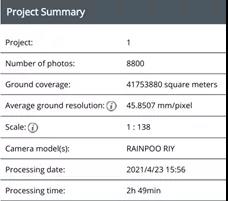 在本次项目中,设计航高为350米,地面分辨率(GSD)为4.5cm,测区有效面积约55.6km?,按照外扩一倍航高的距离,所得实际航飞面积约70.2km?,按照常规地形图测量需求,本项目设置航向重叠度80%、旁向重叠度70%进行作业,累计飞行8个架次,单架次飞行时间约42min,共获取27800张影像,所有影像清晰、色彩均匀,能够满足本次项目使用要求。