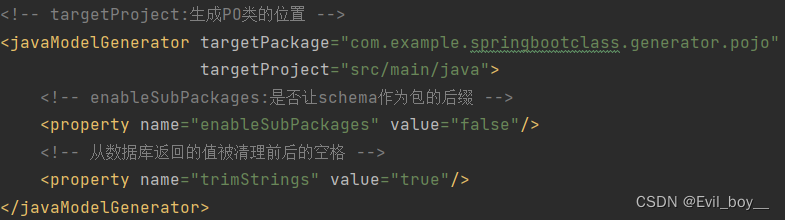 <javaModelGenerator targetPackage="com.example.springbootclass.generator.pojo"