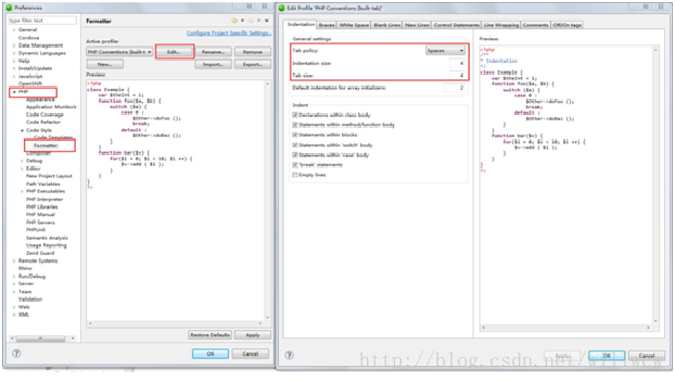 2,点击PHP->CodeStyle->Formatter->Edit选择Spaces 填入红色框中的数字4,4即可